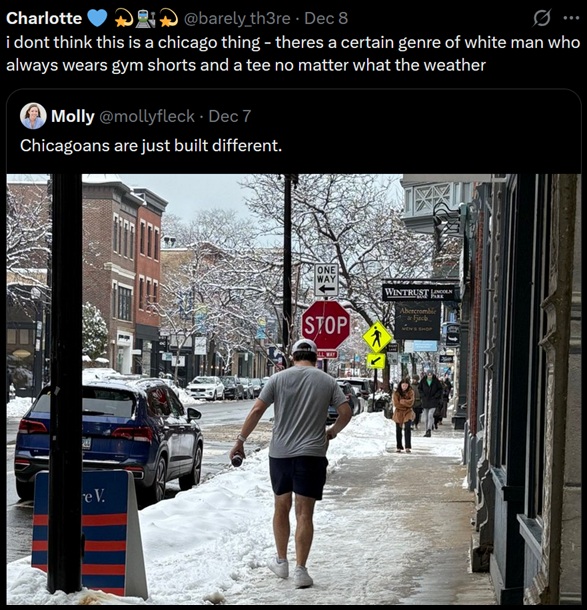 >>217460770Peak "performative male" activity. There's always that one guy who wants to prove he's a tough guy, but I can't say I've ever seen anyone doing it consistently, day in and day out throughout a winter. I did it myself once or twice in college, saw a kid doing it a few days ago. It can actually be rather dangerous.>>217461782No need to put on the full winter outfit for that, your point is well taken, but you should have at least one layer. People lose their keys all the time.>>217460994Don't you mean "chilly"? :^)