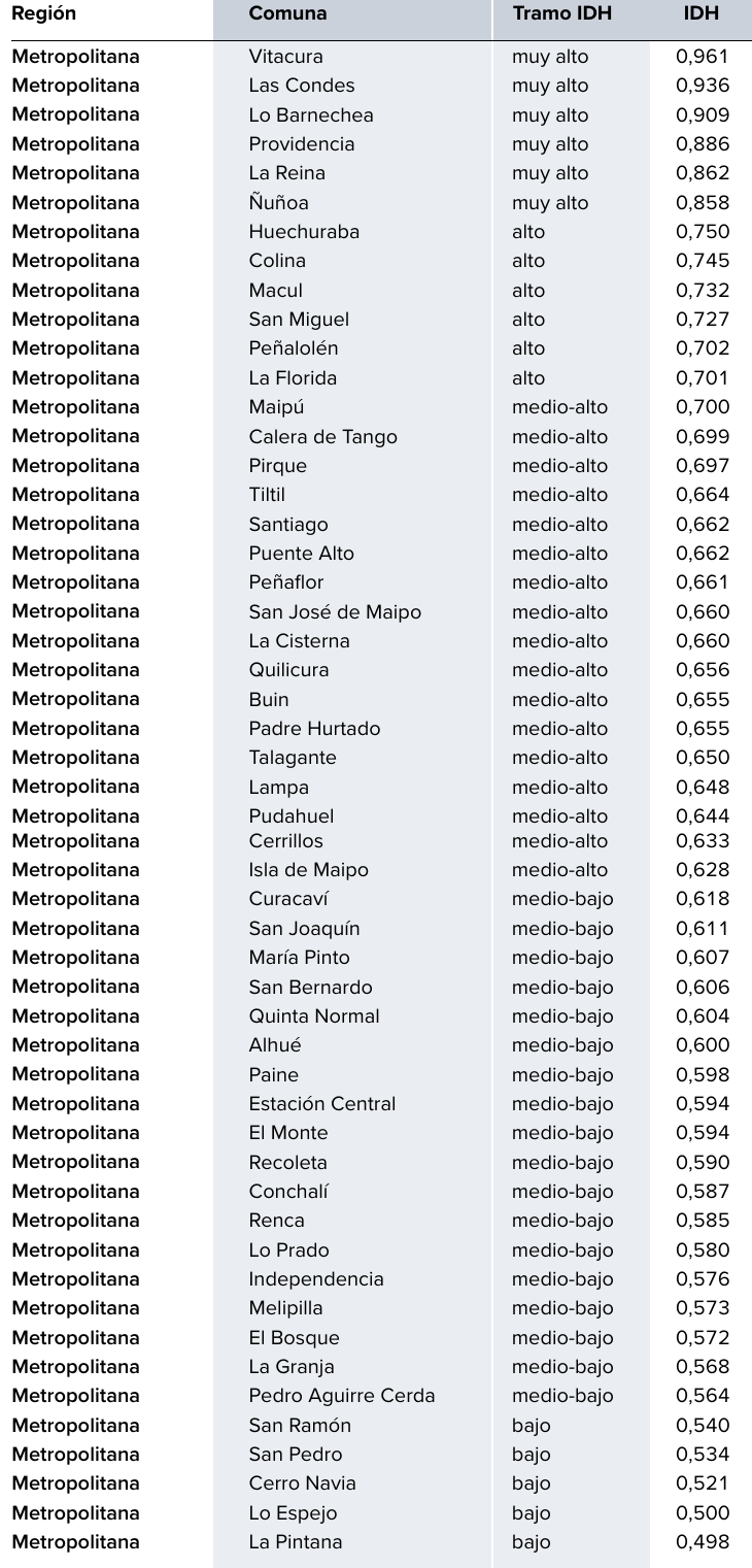 >>215666097Vitacura: ~97,000Las Condes: ~324,000Lo Barnechea: ~124,000Providencia: ~151,000La Reina: ~97,000Ñuñoa: ~208,000Huechuraba: ~113,000Colina: ~227,000Macul: ~148,000San Miguel: ~108,000Peñalolén: ~241,000La Florida: ~402,000Maipú: ~574,000Calera de Tango: ~32,000Pirque: ~27,000Tiltil: ~23,000Santiago: ~406,000Puente Alto: ~700,000Peñaflor: ~123,000San José de Maipo: ~18,000La Cisterna: ~91,000Quilicura: ~220,000Buin: ~112,000Padre Hurtado: ~70,000Talagante: ~76,000Lampa: ~158,000Pudahuel: ~246,000Cerrillos: ~95,000Isla de Maipo: ~38,000Curacaví: ~39,000San Joaquín: ~97,000María Pinto: ~13,000San Bernardo: ~316,000Quinta Normal: ~108,000Alhué: ~5,700Paine: ~80,000Estación Central: ~149,000El Monte: ~35,000Recoleta: ~157,000Conchalí: ~130,000Renca: ~150,000Lo Prado: ~94,000Independencia: ~110,000Melipilla: ~140,000El Bosque: ~176,000La Granja: ~126,000Pedro Aguirre Cerda: ~98,000San Ramón: ~96,000San Pedro: ~8,500Cerro Navia: ~142,000Lo Espejo: ~116,000La Pintana: ~189,000Lo que significa que:91% de la ciudad vive en partes con HDI < .887 | 0.889 (Croacia, Latvia)(HDI nacional es 0.878)86% vive en partes con HDI < .750 | 0.752 (Líbano) 0.754 (Jordania, Egipto)77% vive en partes con HDI < .702 | 0.709 (Venezuela) 0.706 (Nicaragua)63% vive en partes con HDI < .664 | 0.685 (India, Bangladesh) 0.674 (Palestina, Guinea Ecuatorial)23% vive en partes con HDI <= .598 (Zimbabwe)https://www.undp.org/es/chile/publicaciones/el-desarrollo-humano-de-las-comunas-de-chilehttps://en.wikipedia.org/wiki/Countries_by_HDI