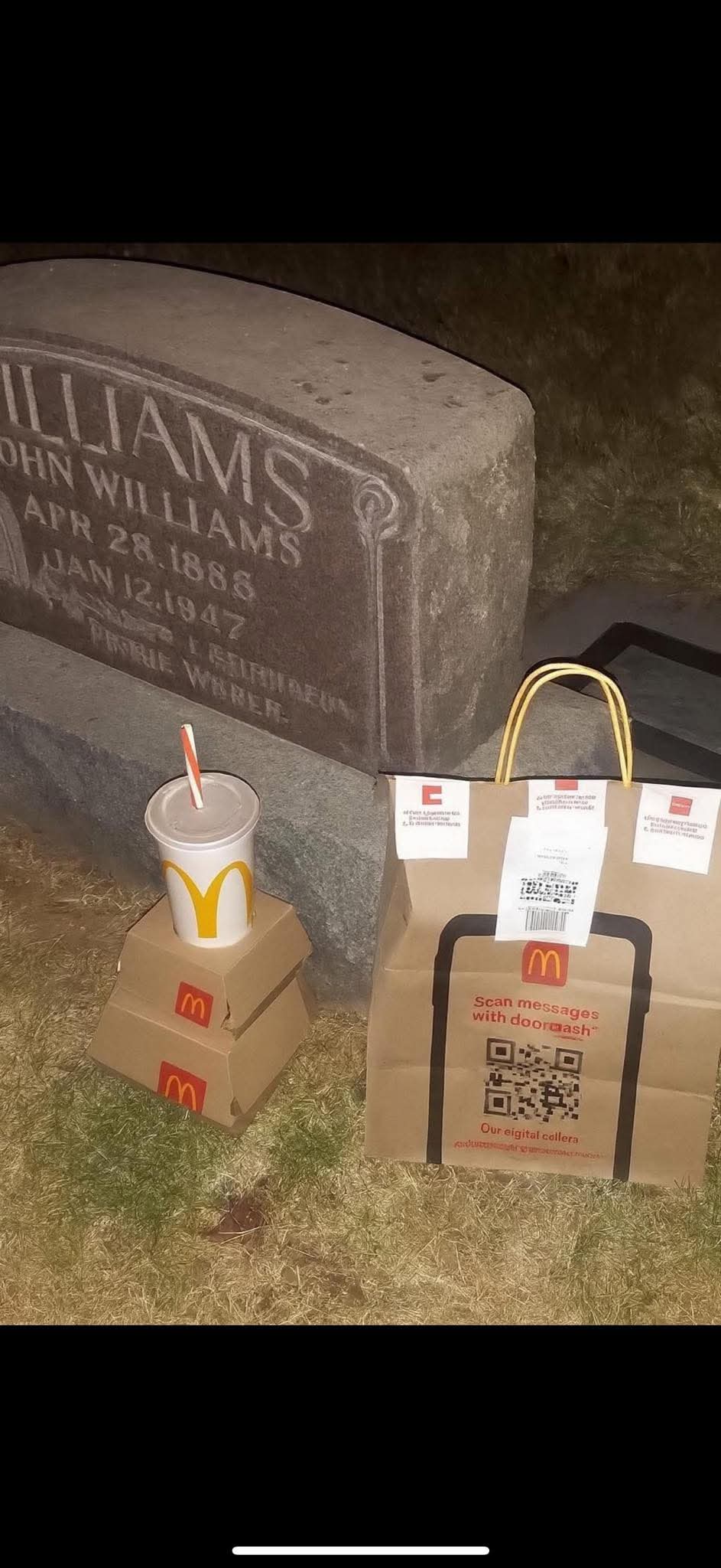 YALL!!!!!! So it’s around 2am, I grab this DoorDash order thinking it’s just a normal drop off…..“Instructions say: “Leave it on the welcome mat with my name on it.”Cool, simple. Except… when I pull up, there’s no house. Just… gates. I drive in thinking it’s maybe a big property…..WELP nope. My GPS says “You’ve arrived,” and I look up….I’m sitting there like, Ain’t no way. So I get out, shine my flashlight… and BOOM right there in front of me is a headstonee… With the SAME name as on the order. WILLIAMS. I drop that McDonald’s bag so fast, take the picture, run back to my car.Then my phone buzzes…. “You forgot my drink.”I look in my passenger seat & the drink’s GONE. At that point, I just said, NOPE…. and drove away…Still got a 5-star rating but when I checked the app this morning…the order’s still marked as ‘in progress.’ I had to call doordash and manually cancel the order.