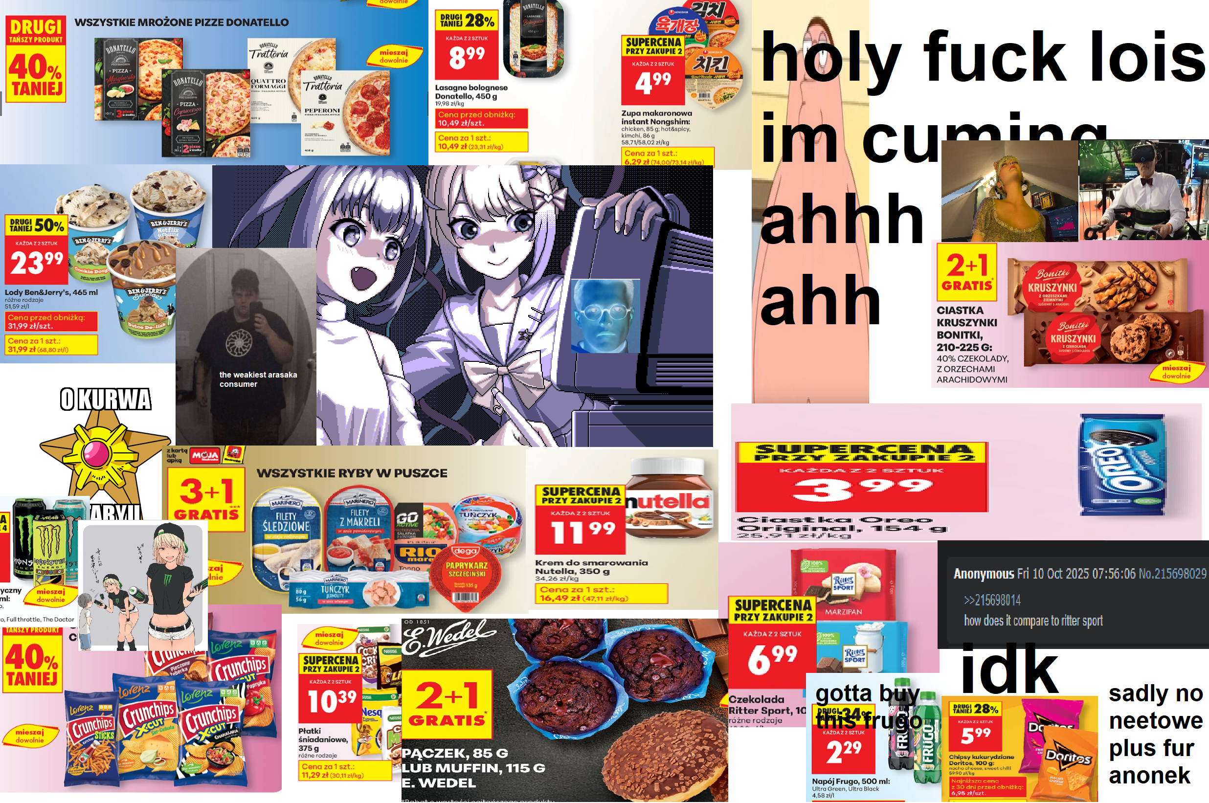 bought shitton of monsters lots of them are rio punchchocapic, cookie crispwedel's pączuchylays max gyros, crunchips beef o algotopjoy bilberry & apple2 ben & jerry cookie dough2 korean kimchi instant soups3 dark chocobars2 ritter sports cuz i don't know >>215698022 oreo packs6 margharitasi might forgot about something but idk idc