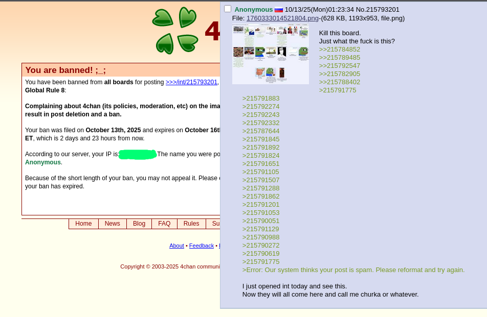 Protip:>4chan global rules>8. Complaining about 4chan (its policies, moderation, etc.) on the imageboards may result in post deletion and a ban.