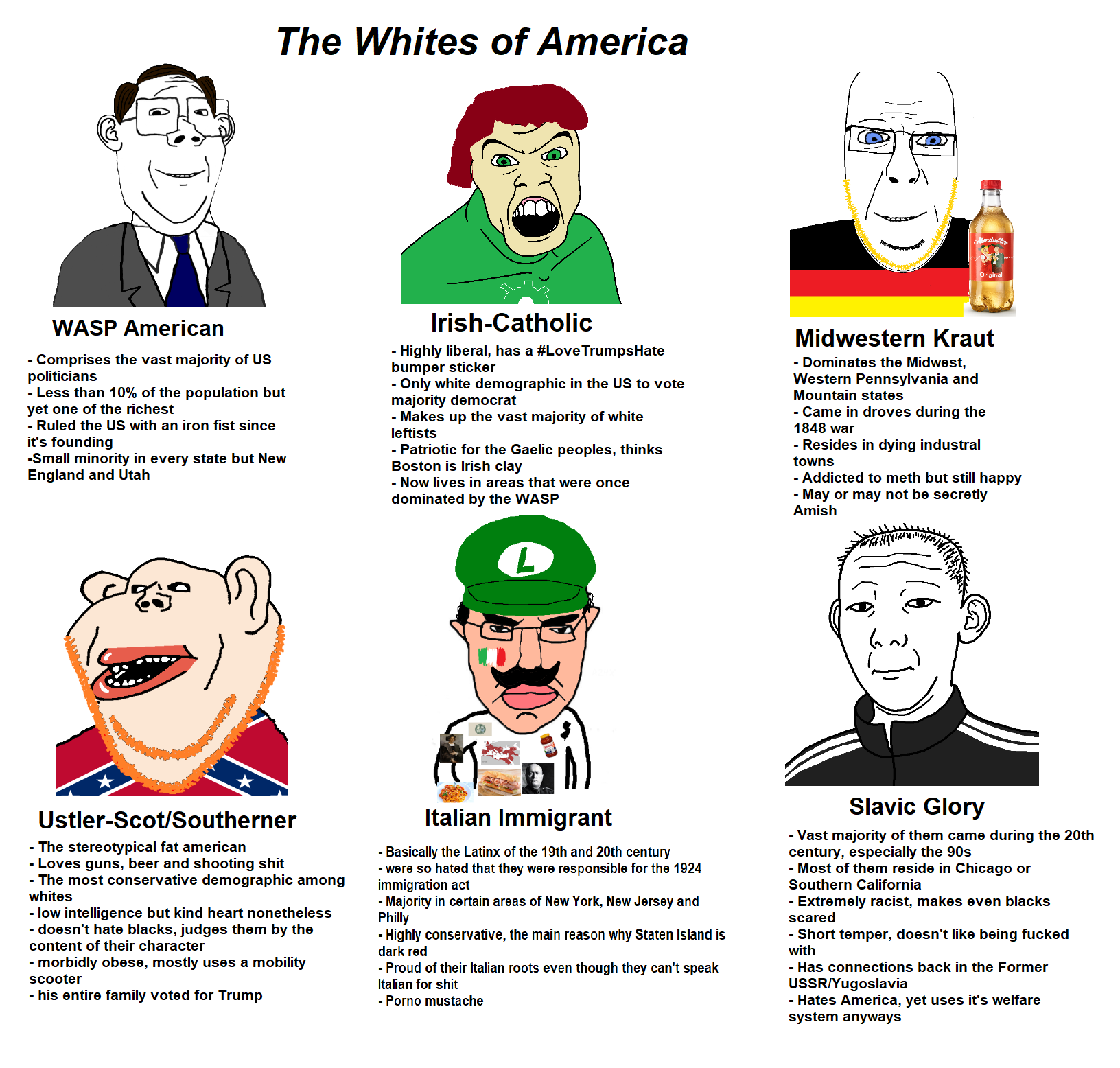 >>215848070I'd say WASP's and the Germans who had their culture annihilated due to the WWs are the default white stock. The Irish, Italian, dixiefags have a separate conscience