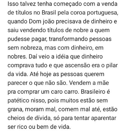 >>215869604Brasil é uma sociedade barroca.O que importa são a aparência e o exagero.Muito do crime vem disso.Pessoas que não passam necessidade cometem crimes para poderem comprar marcas caras para ostentarem barrocamente..