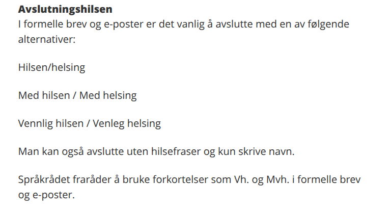 >>215875294https://www.regjeringen.no/no/om-nettstedet/innholdsstrategi/ti-bud-for-godt-innhold-pa-regjeringen.no/skriveregler-for-regjeringen.no/id2517901/#avslutningshilsen