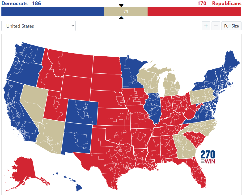 There are 186 seats in Democratic states, 170 in Republican states, 79 in purple states. Republicans dominate the governments of NC, Georgia, which has allowed them to draw favorable maps in those states which gives them an advantage, however if they are unable to hang onto those governments the advantage will end up being in favor of the Democrats. Wisconsin's supreme court now has a liberal majority and Democrats have a chance to flip NC's court over the next 2 elections if they turn out to be unfavorable. If that happens, Republicans will no longer be able to gerrymander NC and would lose the national advantage at gerrymandering.