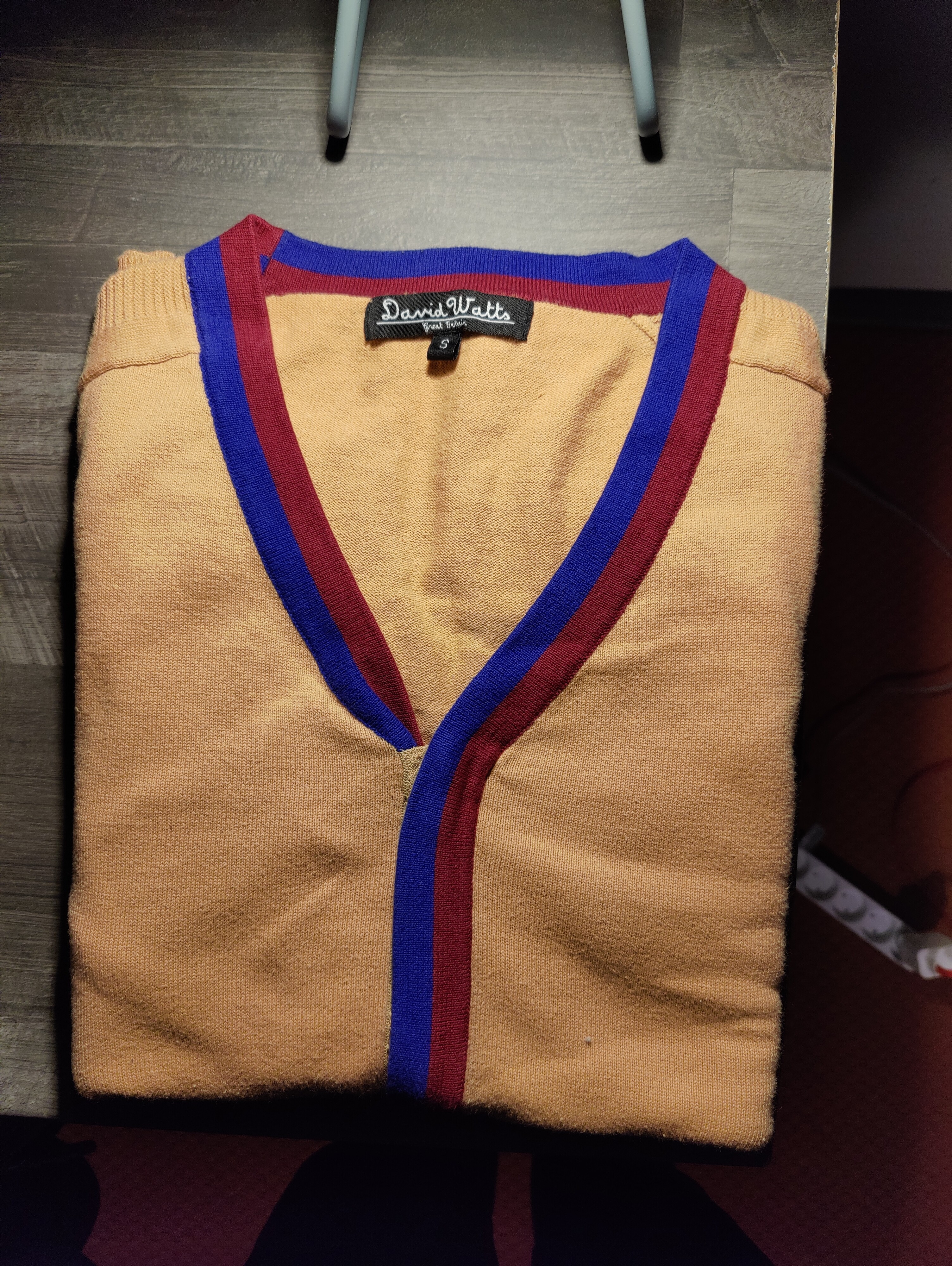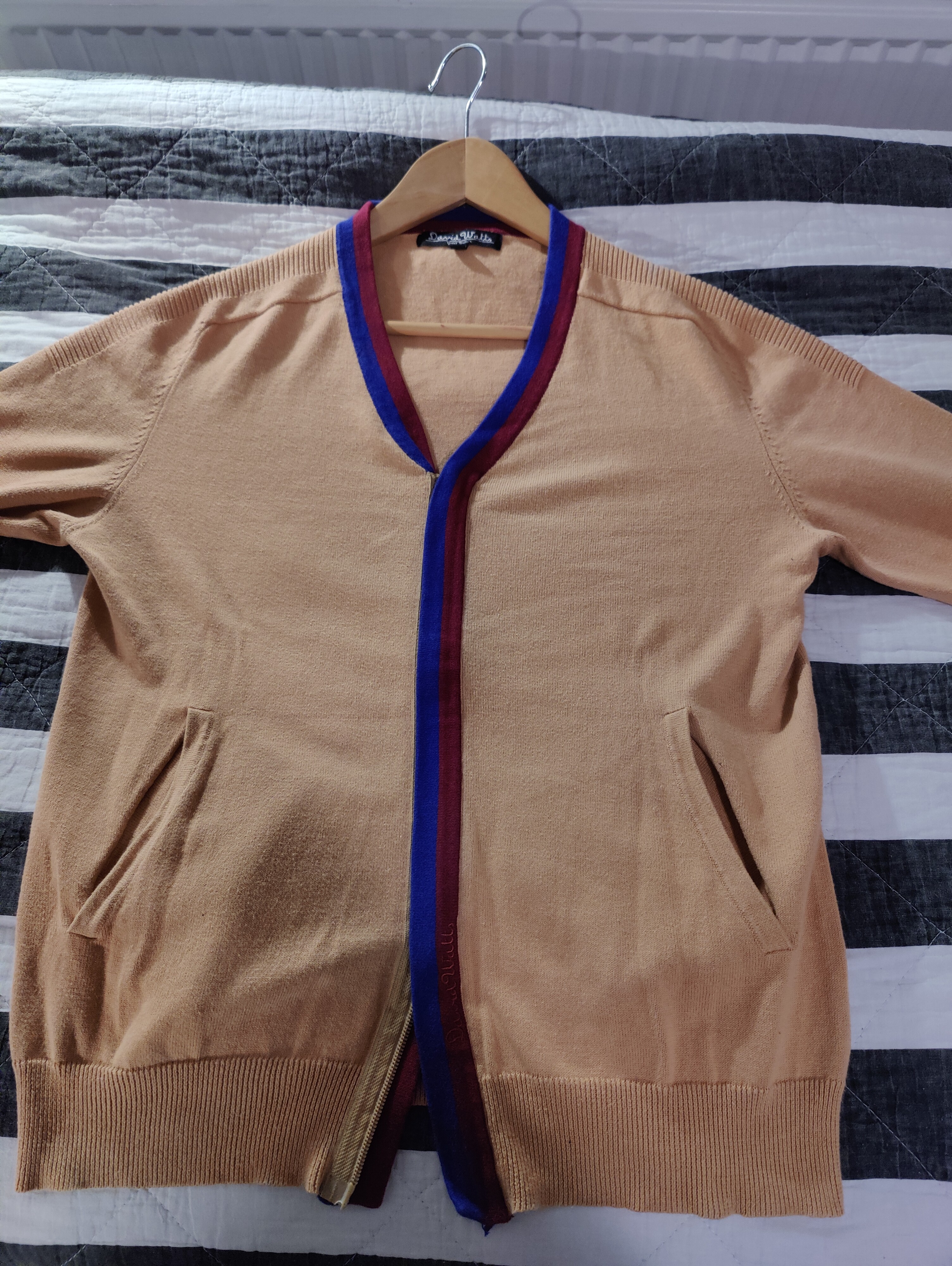 Præcis. Til sammenligning af den originale cardigan kan man se at den blå stribe er langt mere mørkeblå frem for den mere lyseblå på denne cardigan jeg fandt.