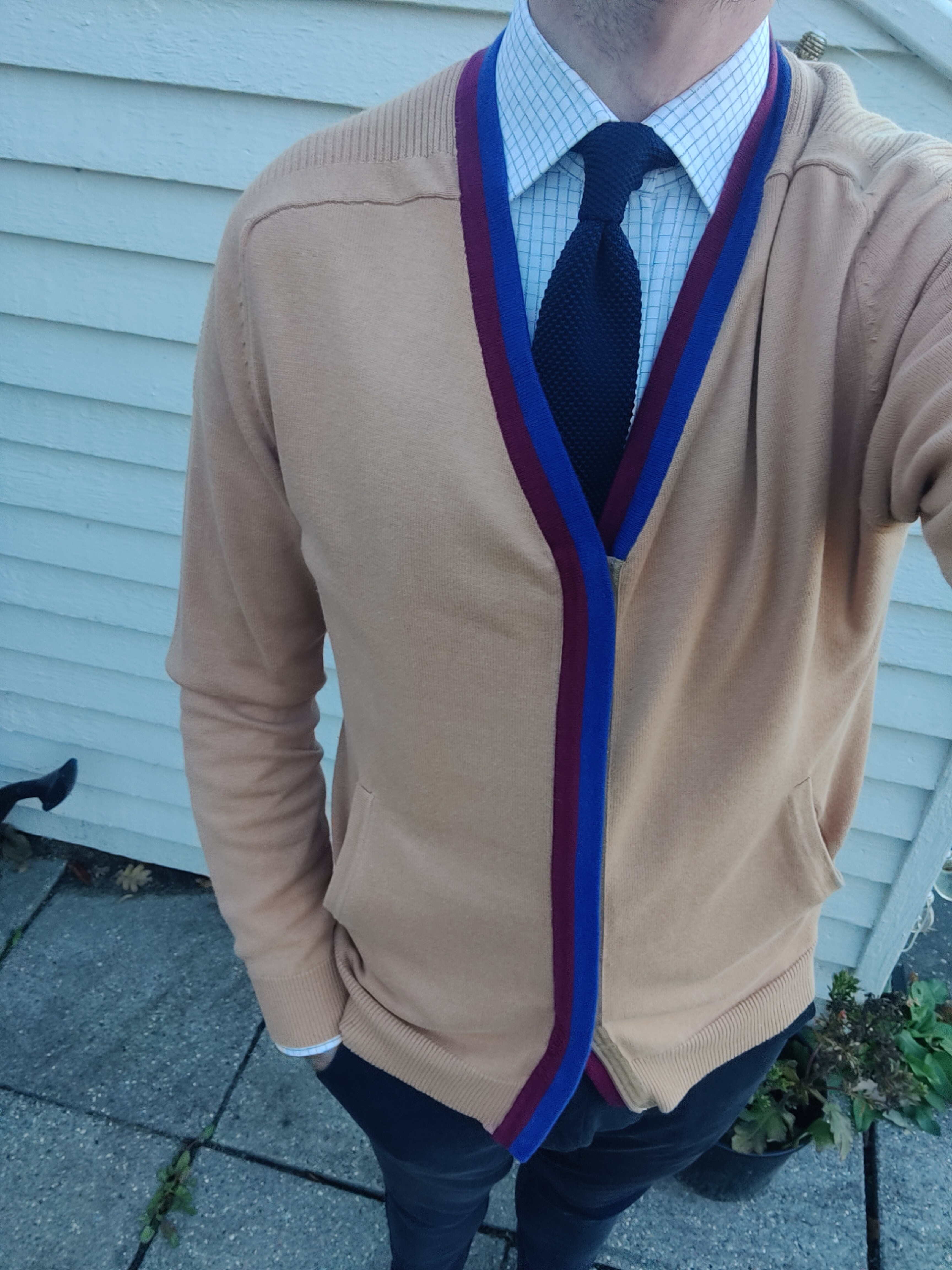 Ved sgu ikke rigtig hvad jeg skal sige til farven. Den er mere lys (sandfarvet) end den originale Dries Van Noten. Nu tog jeg blot cirka hvad Q havde på i Skyfall med hvid skjorte og navy blå strikslips. Synes farverne clasher lidt for meget.