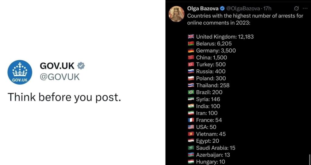 i dont know if every country records an "arrests for online comments" statistic, and if they did i don't know if they would all quantify it in the same way