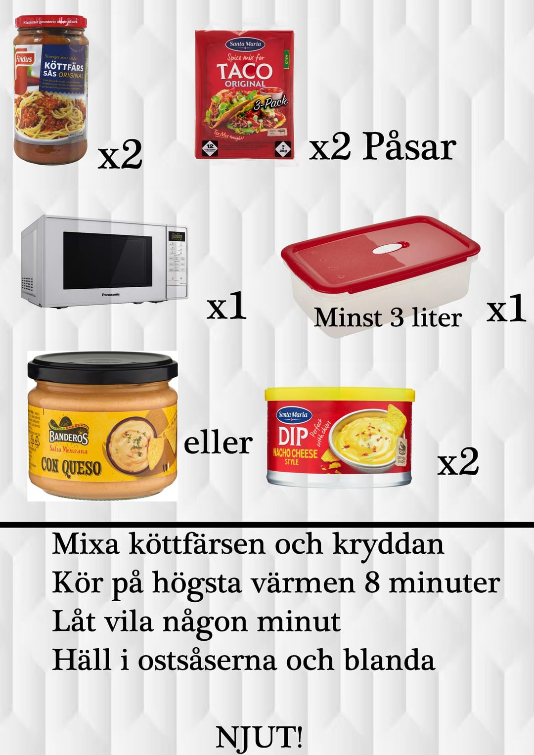 >>215960020Hade nog gärna haft nachochips eller något till, och hade skippat ostdippen för färsk riven ost.