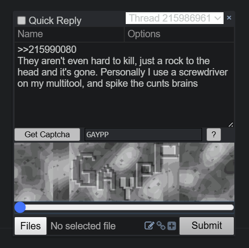 >>215990080They aren't even hard to kill, just a rock to the head and it's gone. Personally I use a screwdriver on my multitool, and spike the cunts brainsAlso, legendary captcha holy shit