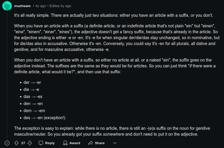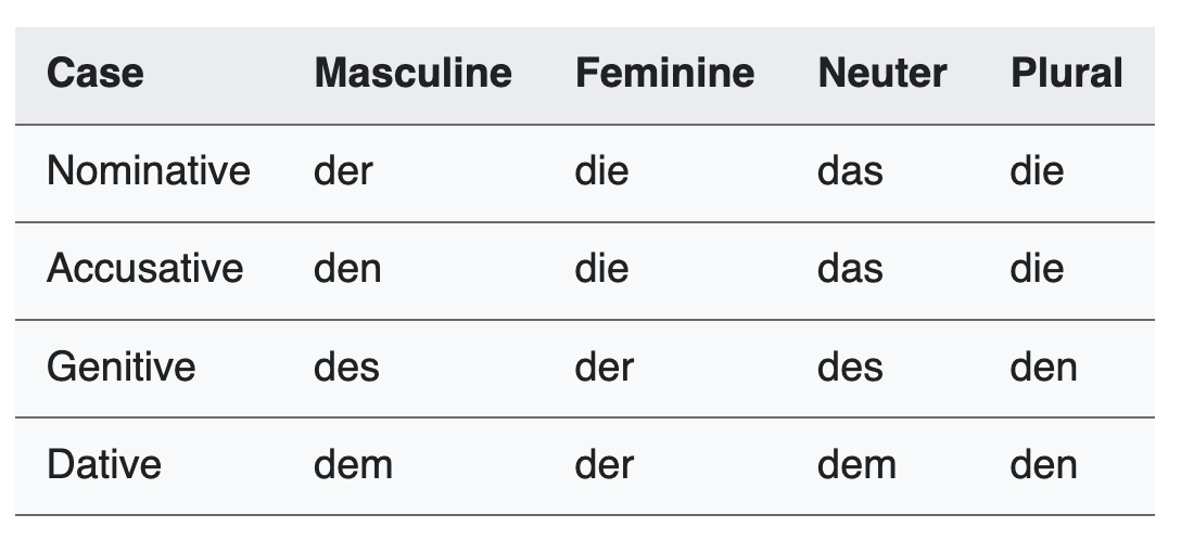 >>216041747These sorts of pics would be much easier for beginners to understand if they made these in "Masculine, Neuter, Femine, Plural" order that all Finnish materals for German I've seen use. It's giga easy to understand since instead of seeing four completely different sets of articles for each gender and case, you see that Masculine and Neuter have the same Genetive and Dative, Feminine and Plural have the same Nominative and Accusative, and the further left you go, the simpler the articles get.