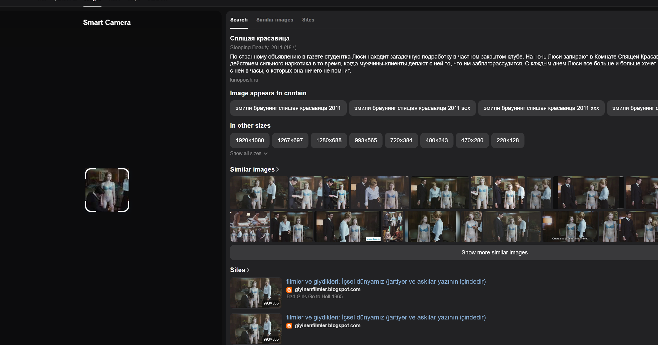 >>216035310Sleeping Beauty (2011)Does Yandex Image search work for you guys? It doesn't give me any results no matter what picture I upload...