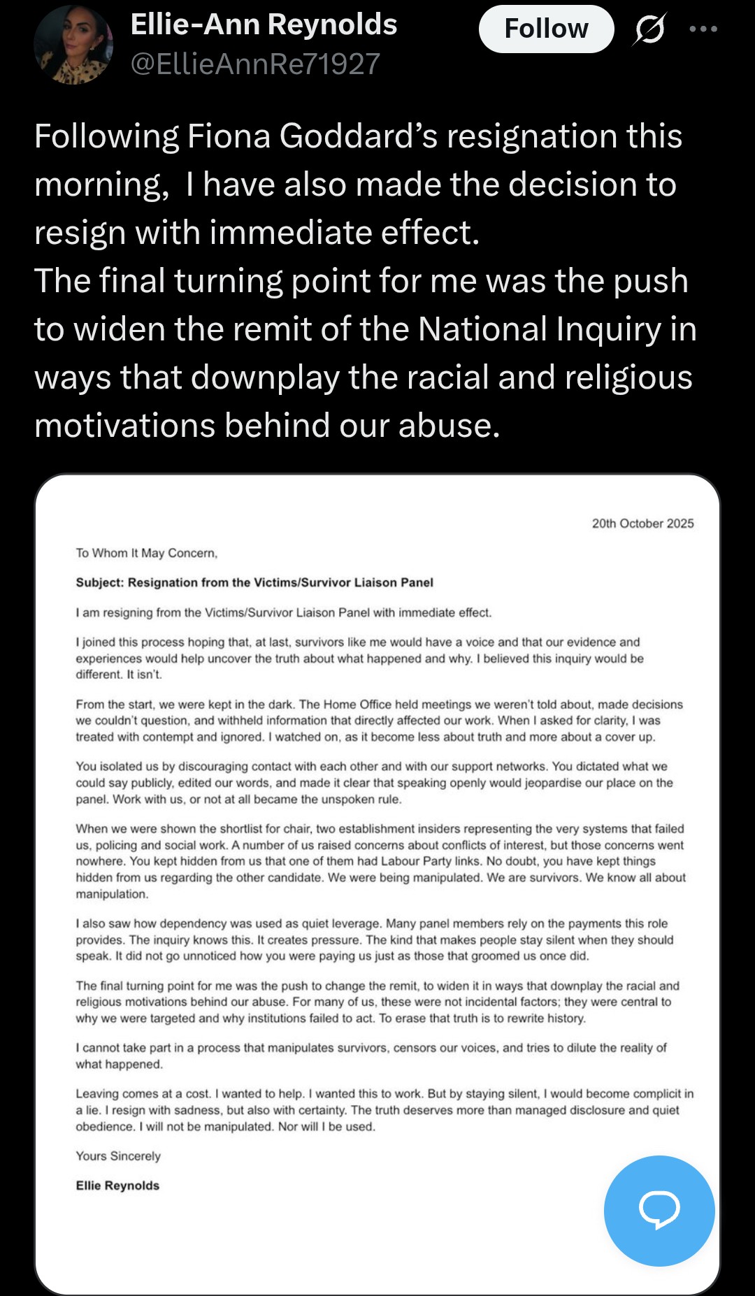 >inviting slags dumb or mentally ill enough to get groomed by browns who could barely speak English to your victims/survivors liason panelLass is openly tweaking for reform and generating outrage so she's obviously smartened up since her youth