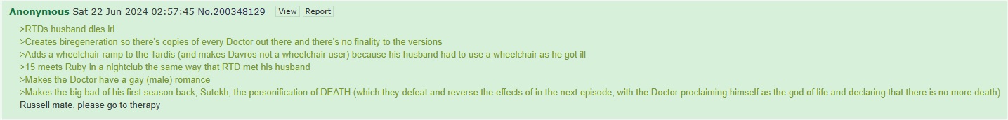 >>216073013because /who/ is unironically deadused to be one daily even when the show wasn't airing but now there hasn't been a thread in months and any attempt to create them don't even get more than 10 replies the last thread to even be active was a leebait OPhttps://archive.4plebs.org/tv/search/subject/who%20general/