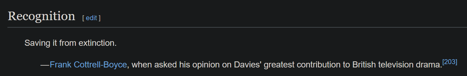 >>216073157There used to be decent worldbuilding in the Classics from the likes of Philip Hinchcliffe and Terry Dicks. Nowadays modern showrunners just take a shit on everything before them because they're all desperate to cement their legacy in the show. Steven Moffat introduced a secret Doctor incarnation played by John Hurt in the 50th anniversary that that opened the pandora's box for every showrunner to attempt the same, now nobody knows how many fucking Doctors there are or what order they come in.