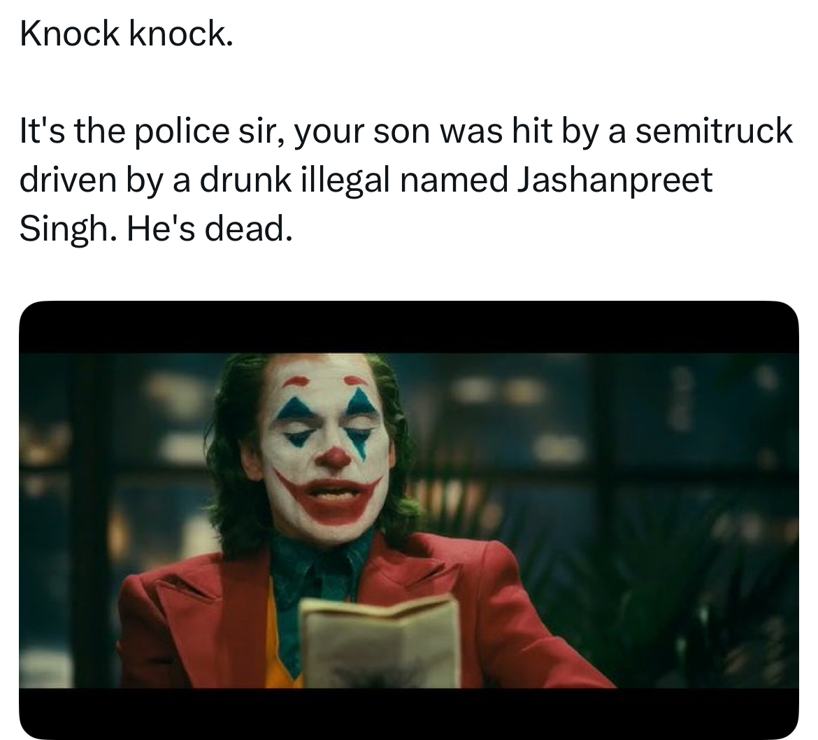>>216132664In California illegals can get drivers lisenced and CDLs like the one that killed those people in Florida, and the governor still went on TV and said illegal immigration is good for America Newsom is a joke