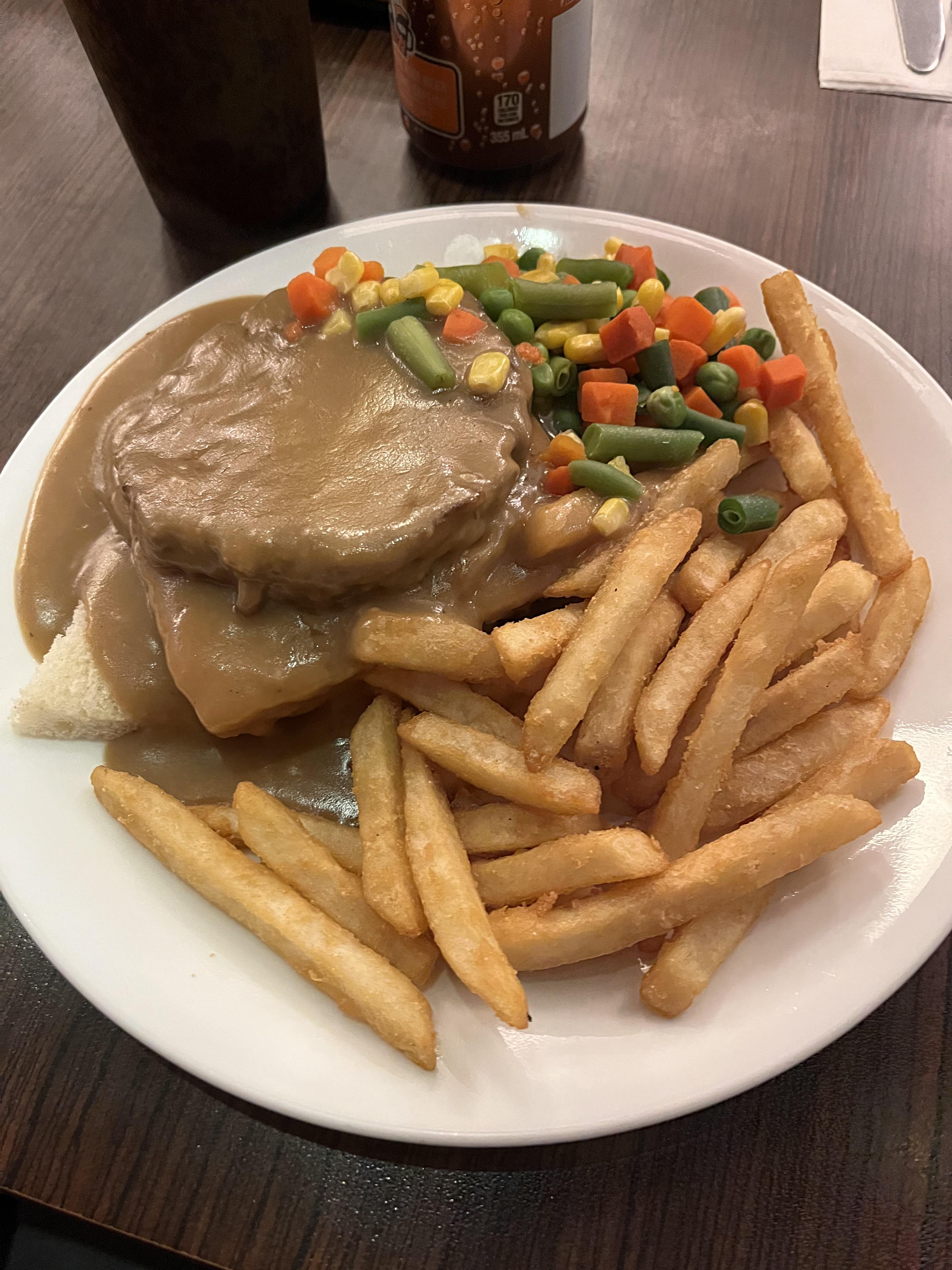A hot hamburger sandwich is a Canadian comfort food featuring a beef patty served open-faced on a slice of bread, covered in a rich brown gravy. It is a classic diner staple, often served with a side of french fries or mashed potatoes and vegetables.