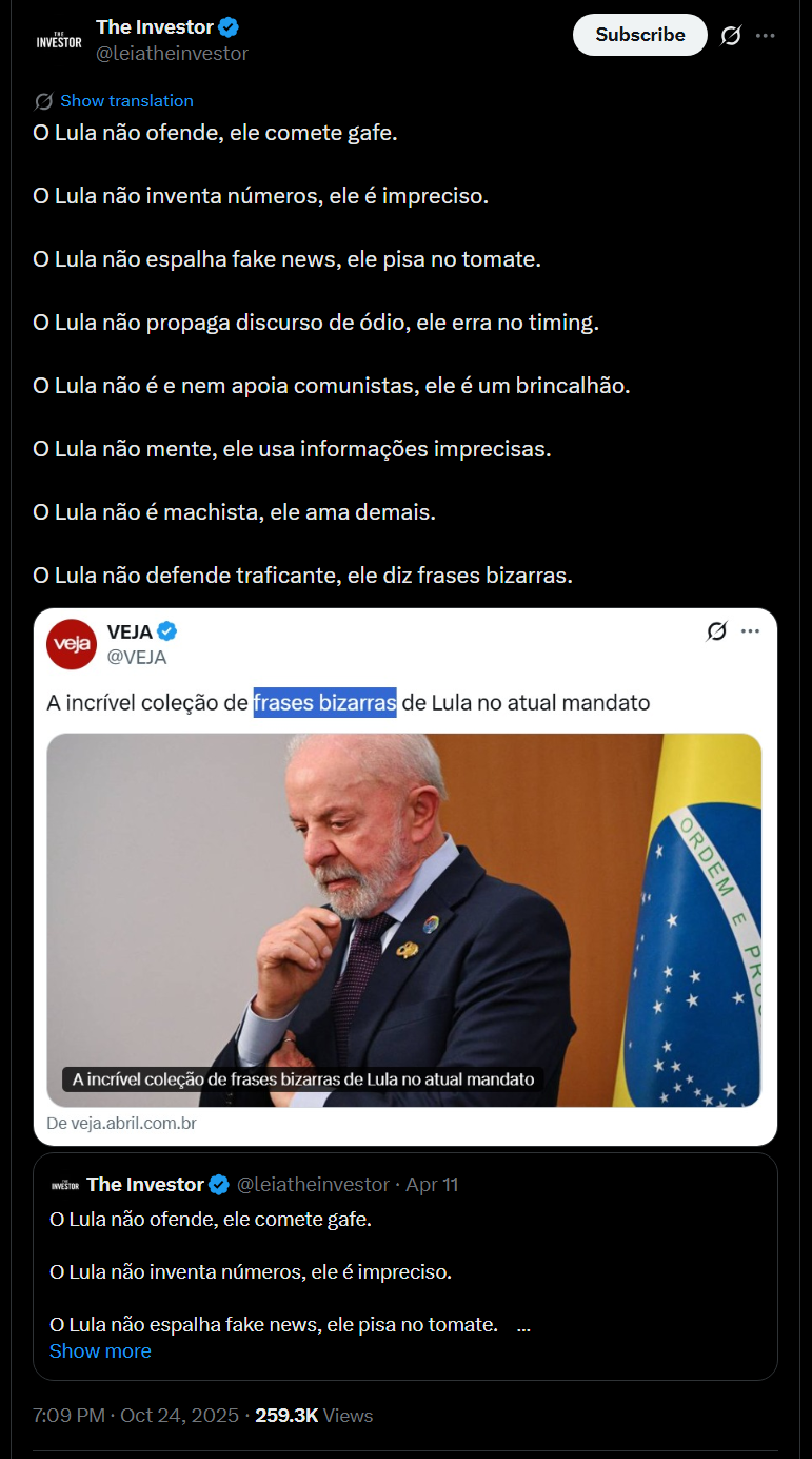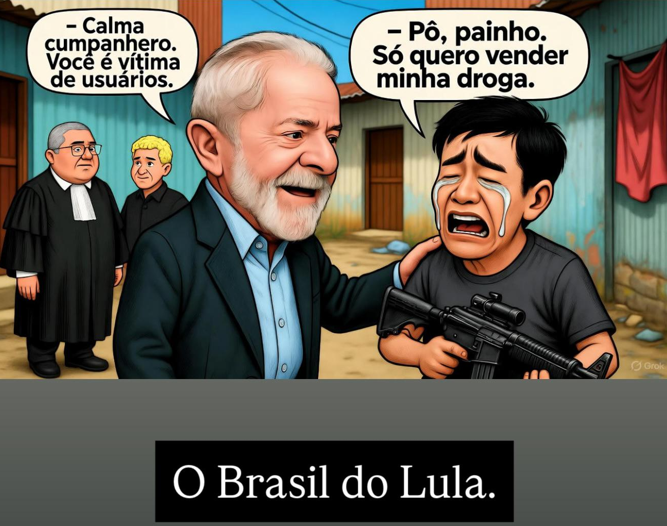 A direita é burra quando diz que Lula está se contradizendo ao falar sobre traficantes. Primeiro entronizaram na mentalidade brasileira que usuário pode consumir qualquer coisa, mesmo sendo crime o consumo e compra. Algum usuário que você conhece está preso? O próprio idiota do Duvivier questionou a polícia porque eles não o prendem “pois ele é rico e mora no Leblon” (aliás, poderiam prendê-lo). Agora é só o próximo passo: fazer os traficantes de coitados. No fim, está tudo liberado. Toda vez que alguém fala que o tráfico causa males porque drogas não são liberadas devido à “guerra contra as drogas” no ocidente eu rio. Não existe nenhuma guerra contra drogas aqui. Quer ver guerras contra drogas de verdade? Vá em alguns países muçulmanos, até mesmo China. Lá o usuário muitas vezes é até morto. Traficante não se dá nem ao luxo de existir. No ocidente, além de toda essa mentira burra de ambos espectros políticos, ainda temos a esquerda — quem diria —, com suas políticas de “redução de danos”. Se você não sabe, em 2005 criaram essa política para “ajudar viciados”. Internavam? Gastavam com recuperação? Incentivo ao trabalho? Ajuda psicológica? Não. Política de redução de danos consiste em distribuir SERINGAS e AGULHAS LIMPAS para viciados. Sim, tudo pelo glorioso SUS, com dinheirinho do seu bolso. Agora, “oficialmente” essa política cessou. Mas na prática continuam, pois algumas ONGs e municípios fazem na cara dura ainda. É o mesmo esquema da “política de redução de danos” distribuindo anticoncepcional para criança de 10 anos, “pois há crianças que engravidam nessa idade”. O Brasil não está acabado. É que ele nunca nem existiu como país. No máximo tínhamos um esboço.