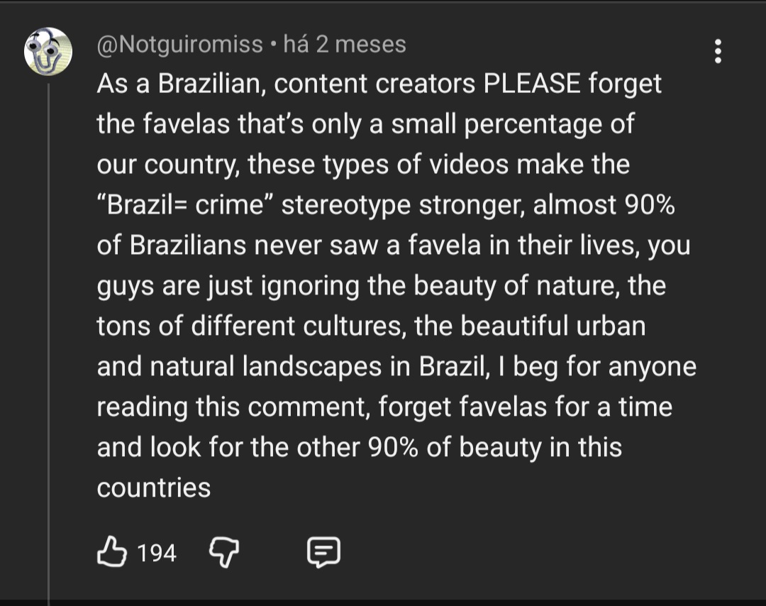 >>216173107todo país tem lugar bonito, natureza bonita, cultura bonitao que vai ficar na mente do mundo são os estereótipos e a cultura da favela está (infelizmente) permanentemente enraizada na nossa imagem