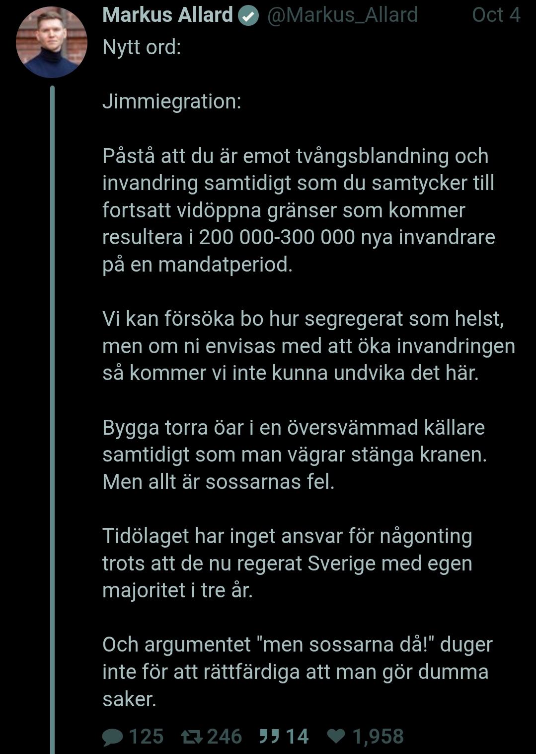 >>216184430Mann1, det är bara medmänsklighet det handlar om när allt kommer omkring.Är ju liberaler som vill ha invandring för att pressa ner löner och höja BNP.