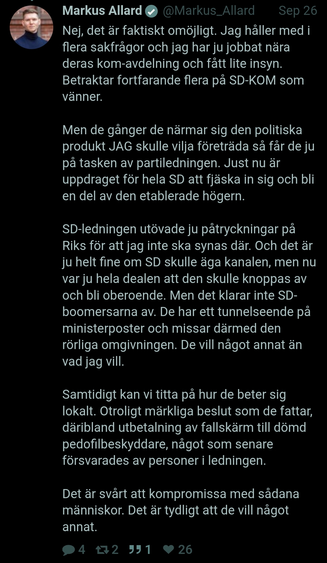 Finns inget parti jag skulle rösta på i dagens läge. Politiker representerar inte mig överhuvudtaget.