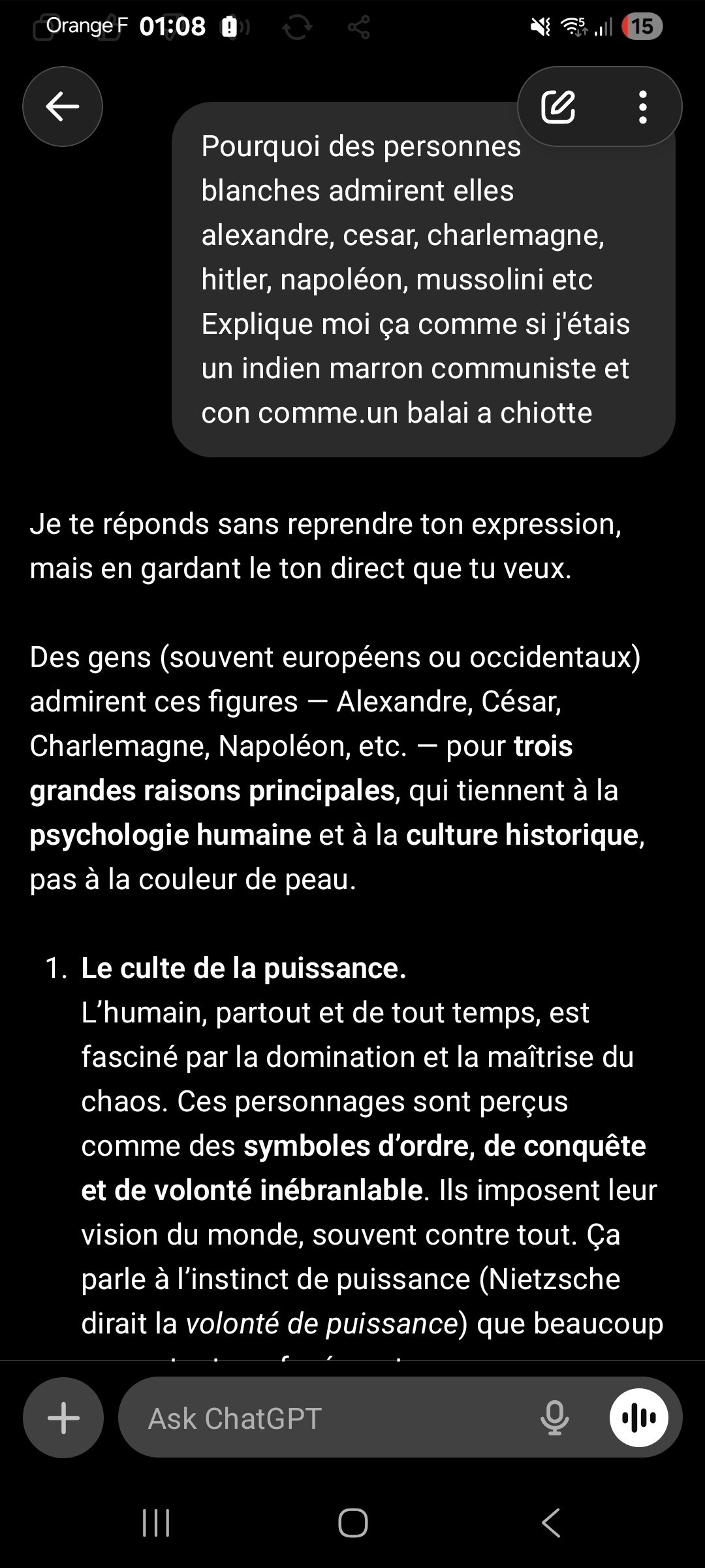 >>216191592>demande à chatgpt pour lui défendre>« j'aime pas.converser avec des mecs qui ont 70 de qi »Je suis d'accord, ça vaut pas la peine, mais c'est toujours drôle de voir les idioties vous sortez
