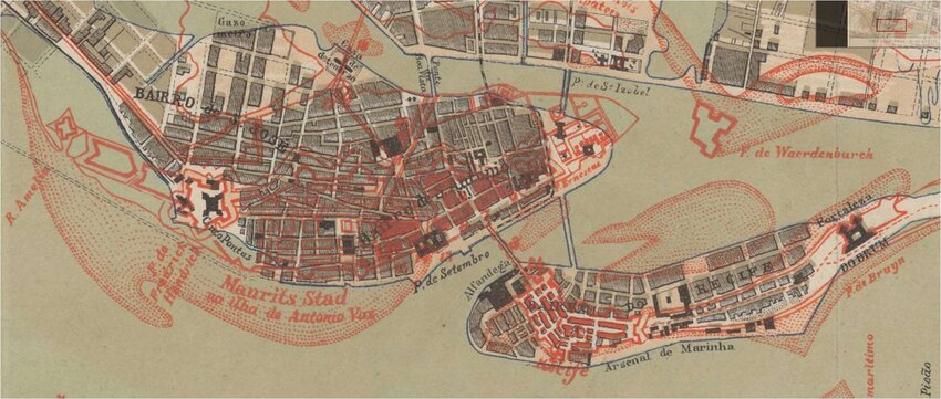 Mapa do Recife 1876, com sombreado comparando com o mapa de 1666.