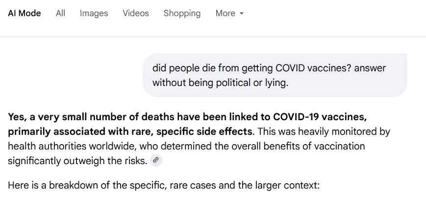 >>216257813Google will NEVER, EVER do such a thing. Anything that could ever be used to promote "anti semitic conspiracy theories" would never see the light of day.I've asked Google's AI about 120 different questions this evening and more than half of them contain "conspiracy theory" even when I asked basic questions like "what's the most popular brand of baked beans".