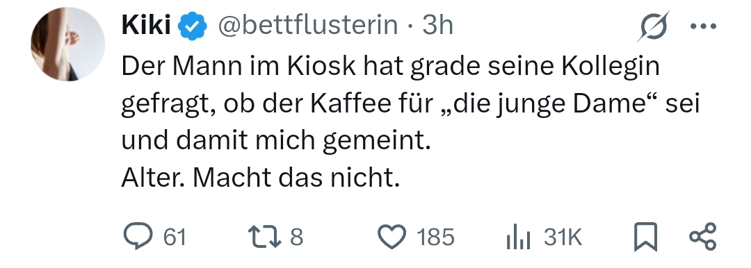 >>216270678Ich würde mich freuen, wenn man mich als junge Dame bezeichnet. Das bedeutet, ich passiere.