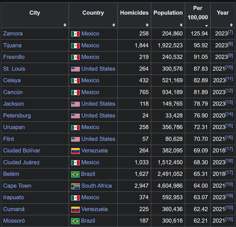 >>216277607What's the criteria for that second list? It just says other. It also lists Hong Kong, which has a lower murder rate than Belfast, which isn't on the list. This is the first list, which has 50 top highest murder rates.