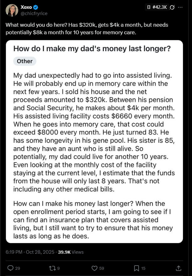 >>216279033kuulin vasta tilanteen suomesta jossa vanhusta oltaisiin laittamassa julkiseen hoivakotiin kun ei enää kotona pärjää edes apustajakäynneillä. niin kauan kun vanhuksen tilillä on rahaa hoivakoti maksaa jotain 6000e kuussa (eli sama kun yksityinen hoivakoti). sitten kun tilillä ei ole enää rahaa sama hoivakoti maksaa alle tonnin kuussa.