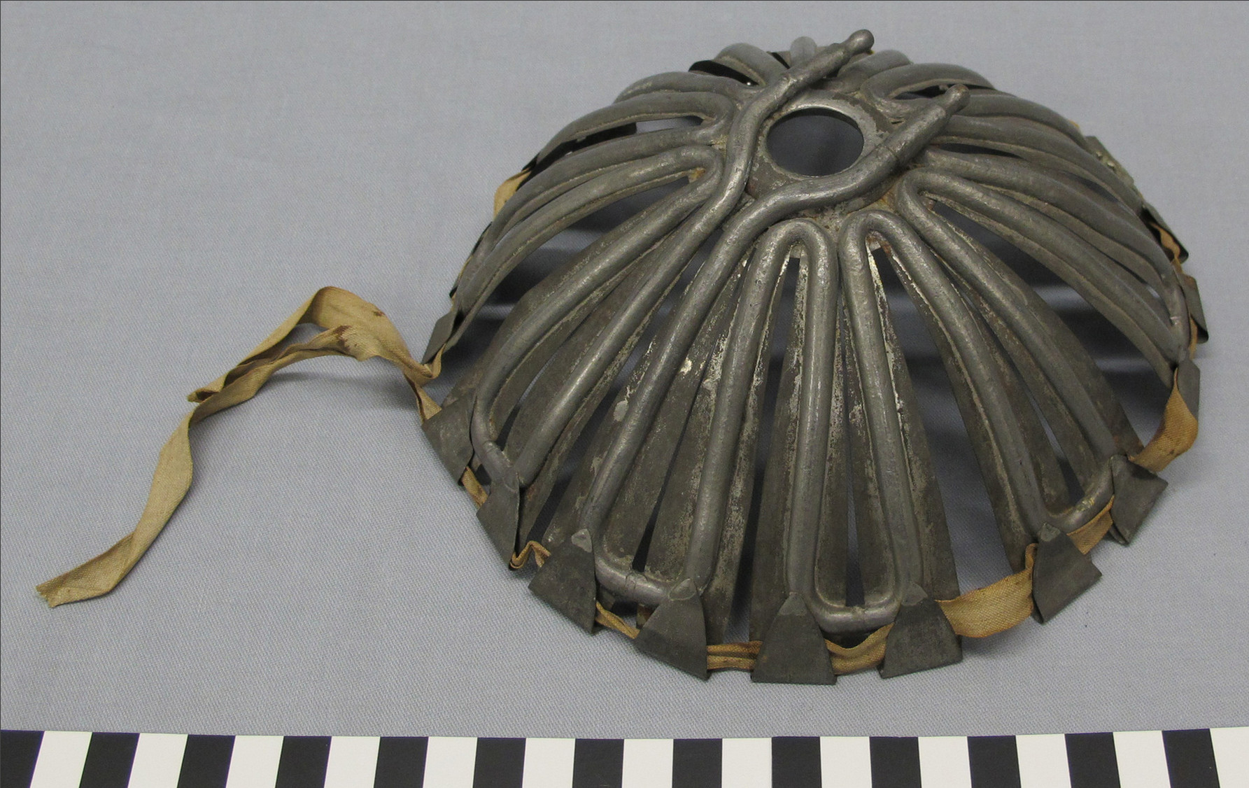 >Tinaseoksesta valmistettu päänjäähdytyskypärä. Alareunaa kiertää kankainen nauha. Kypärän putkistoon voidaan johtaa vettä sisälle.