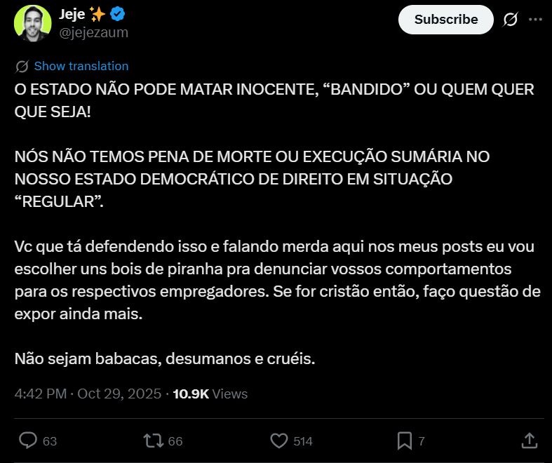 Tratar o que aconteceu como uma vitória é uma burrice tremenda. Mataram 100 bucha que se renderam, pq mataram porco no começo da operação.Agora os menorzin não vão se render, pq sabem que vão ser suicidados. A polícia vai ter que tankar essa merda agora