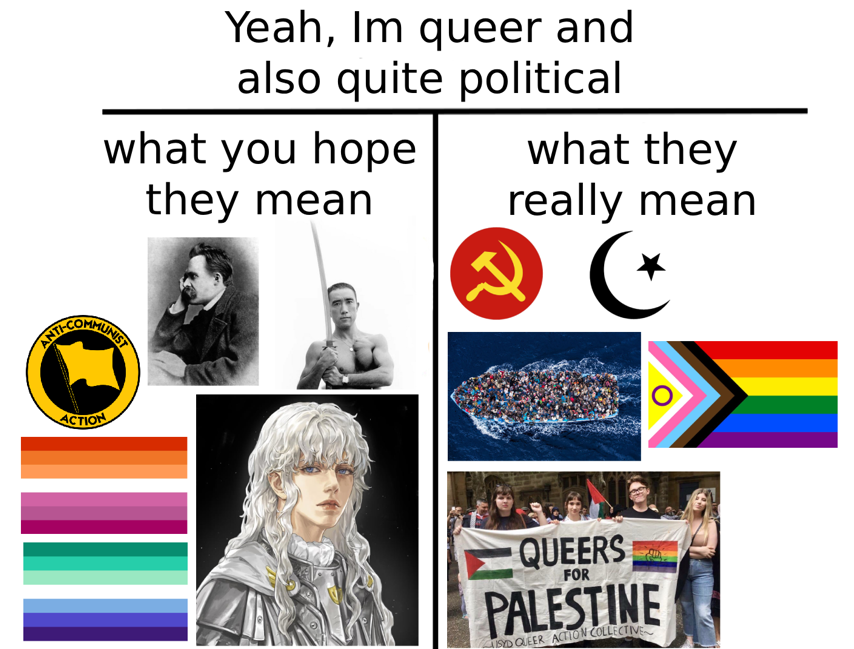 La destra : mi triggheraLa sinistra : mi triggheraIl maschilismo : mi triggheraIl femminismo : mi triggheraIl pisslam : mi triggheraL'ateismo : mi trigghera