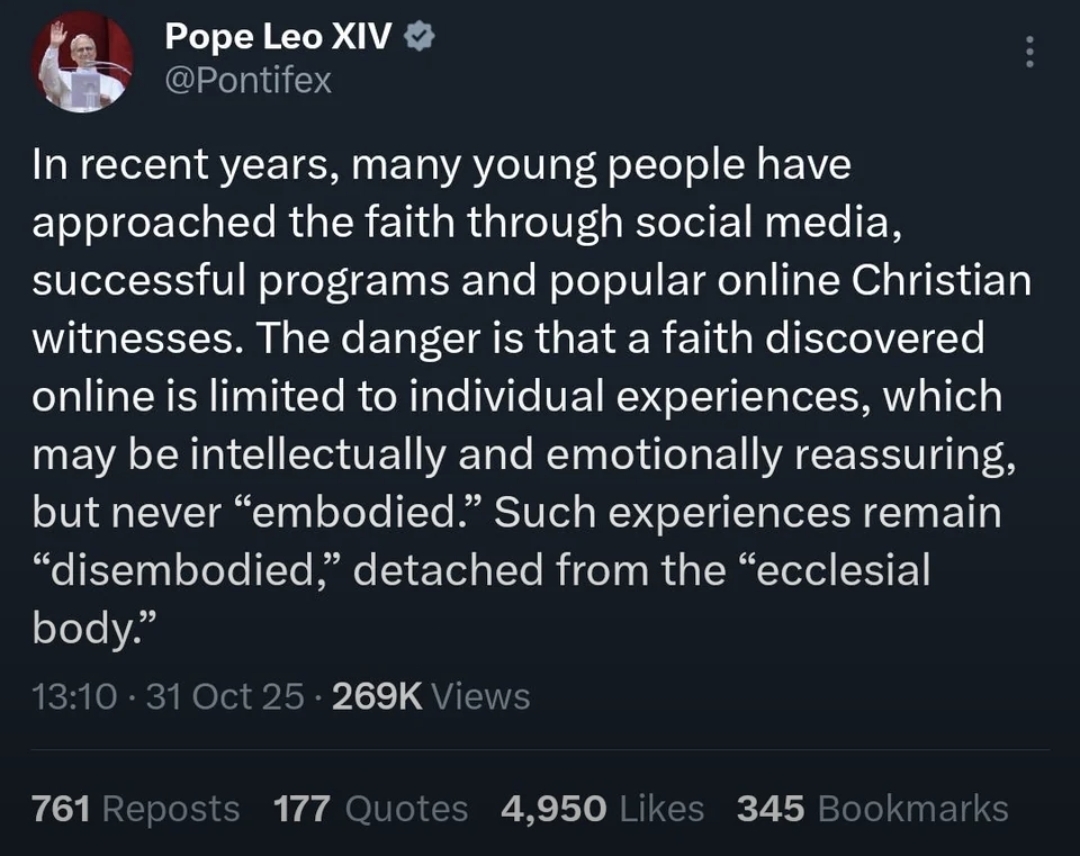 >>216388355it's pretty ironic he's tweeting this instead of writing an encylcipcal i mean i'd almost wonder if it's actually real on that basisbecause there is actuallya good encyclical he could write about the tension within the catholic church between the "embodied"ness of it contra say other denominationsfundamentally salvation is through the "embodiment" of christ so the debate is then whether there is a need for the church to be a sort of complementary to the primary experience of a relationship with christ in my opinionnot being a catholicit seems absurd to suppose that despite a lack of scriptural evidence salvation is only through a formal church having said that if you are a christian and you do not belong to any church you should wonder how you are living in the world as a christian believer and what it is you are actually doing that is in concordance with your faith