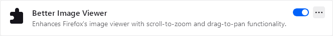 >https://addons.mozilla.org/en-US/firefox/addon/better-image-viewer/Märkligt att det här stendöda halvtrasiga tillägget är den enda vettiga bildvisaren för gecko. Som det står kan man dra runt bilden och zooma in och ut med mushjulet på ett naturligt visRåkar någon veta om det finns ett motsvarande för chromium? Obs måste vara öppen källkod