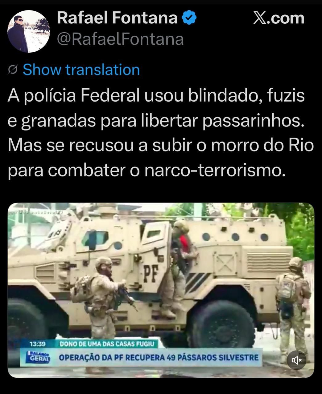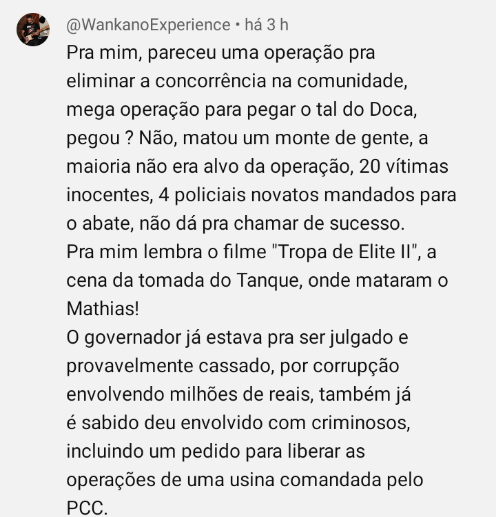 >>216437149>>216436707"Pra mim, pareceu uma operação pra eliminar a concorrência na comunidade, mega operação para pegar o tal do Doca, pegou ? Não, matou um monte de gente, a maioria não era alvo da operação, 20 vítimas inocentes, 4 policiais novatos mandados para o abate, não dá pra chamar de sucesso. Pra mim lembra o filme "Tropa de Elite II", a cena da tomada do Tanque, onde mataram o Mathias! O governador já estava pra ser julgado e provavelmente cassado, por corrupção envolvendo milhões de reais, também já é sabido deu envolvido com criminosos, incluindo um pedido para liberar as operações de uma usina comandada pelo PCC.,"