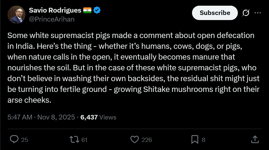 Human shit can't be used as manure, and it's certainly not growing anything when dumped in the street. There are arguments against white supremacists but I don't think "shitting in the street is actually better than using a toilet" is one of them.