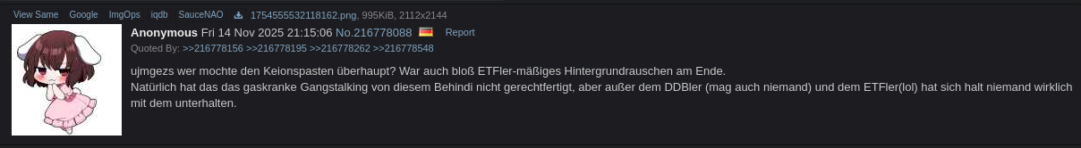 >>216799987Werde jetzt einen neuen Versuch wagen den Faden zu verlassen. Der Keionhasswahnsinniche macht mich kirre. Das hat er tatsächlich geschafft.>>216800020Du kannst dir deine rhetorischen Spielchen gehörigst in den Arsch stecken.