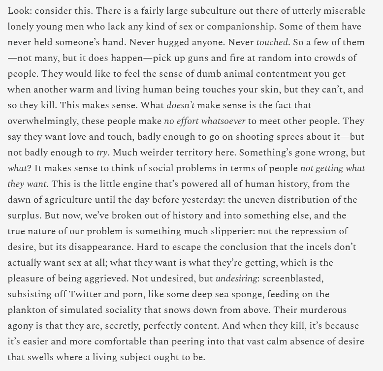 >>216804211The idea of ever integrating someone into my life or having them know what I think is like telling me to go to mars. If I had a girlfriend she would have to be so stupid that I'm just on another plane of existence relative to her and her model of me is of an unknowable intellectual Superman and my model of her is basically correct completely knowable. Women also want this from men ("golden retreiver boyfriend", aka a boyfriend too stupid to plot). Modern dating is basically rigged against intelligent people. The best thing to be is a head-empty lovable idiot and the worst thing to do is have a single independent thought. I don't feel too bad about it. Billions must die