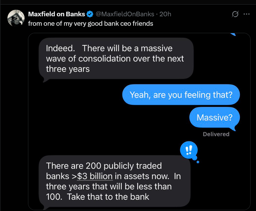 Zoomer grifters are so funny man. Yeah, okay, some random texts means banks are going to consolidate in 3(!) years.
