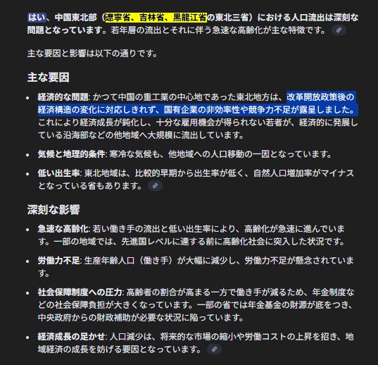 これやな>改革開放政策後の経済構造の変化に対応しきれず、国有企業の非効率性や競争力不足が露呈しました。日本のバブル崩壊と改革開放政策に伴う 大規模な欧米外資の流入 で 資本主義化が促進され 中国の国営企業が 競争力を失い 地場産業が崩壊。若者が 都市部へ移動するようになった。朝鮮族(コリアン)の場合は韓国へ移住みたいな 感じやなそれで 韓国で 中国の朝鮮族の人口が 大幅に 増えてる みたいやな吉林省、黒龍江省 が 特に 朝鮮族 多いらしいから そこからの流入 みたいやなうっしっしっし