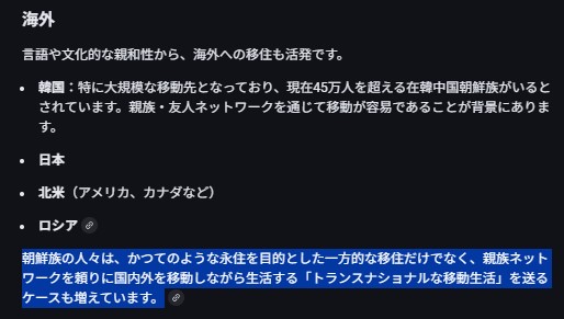 朝鮮族の海外移住先.jpg>朝鮮族の人々は、かつてのような永住を目的とした一方的な移住だけでなく、>親族ネットワークを頼りに国内外を移動しながら生活する「トランスナショナルな移動生活」を送るケースも増えています。コリアンの ユダヤ人化(流浪化)みたいなのが より 顕著になってきたな