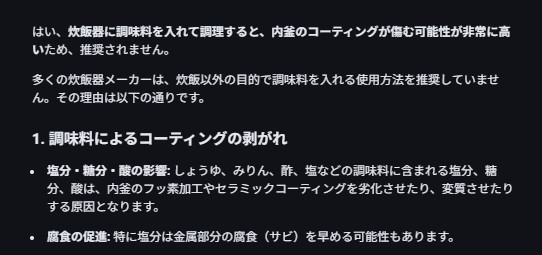 うちの炊飯器は調味料入れて使ってたらすぐ傷んだから、いまはゆで卵マシーンになってる。ガス使って無いから、かなり光熱費やすいわ。うっしっしっし