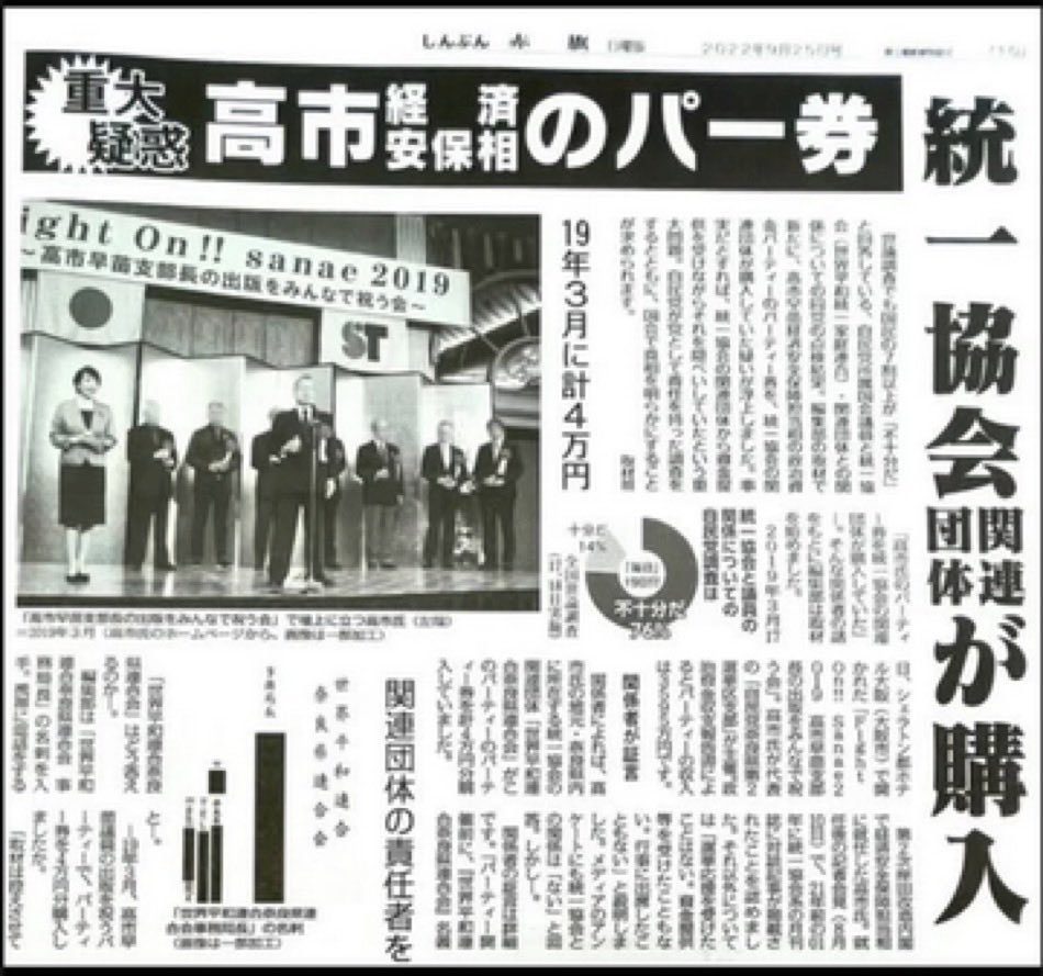 中国への強硬姿勢が外国カルトの司令によるものだとしたら怖いよね。画像は高市早苗の自民党総裁当選を祝う統一教会系新聞。