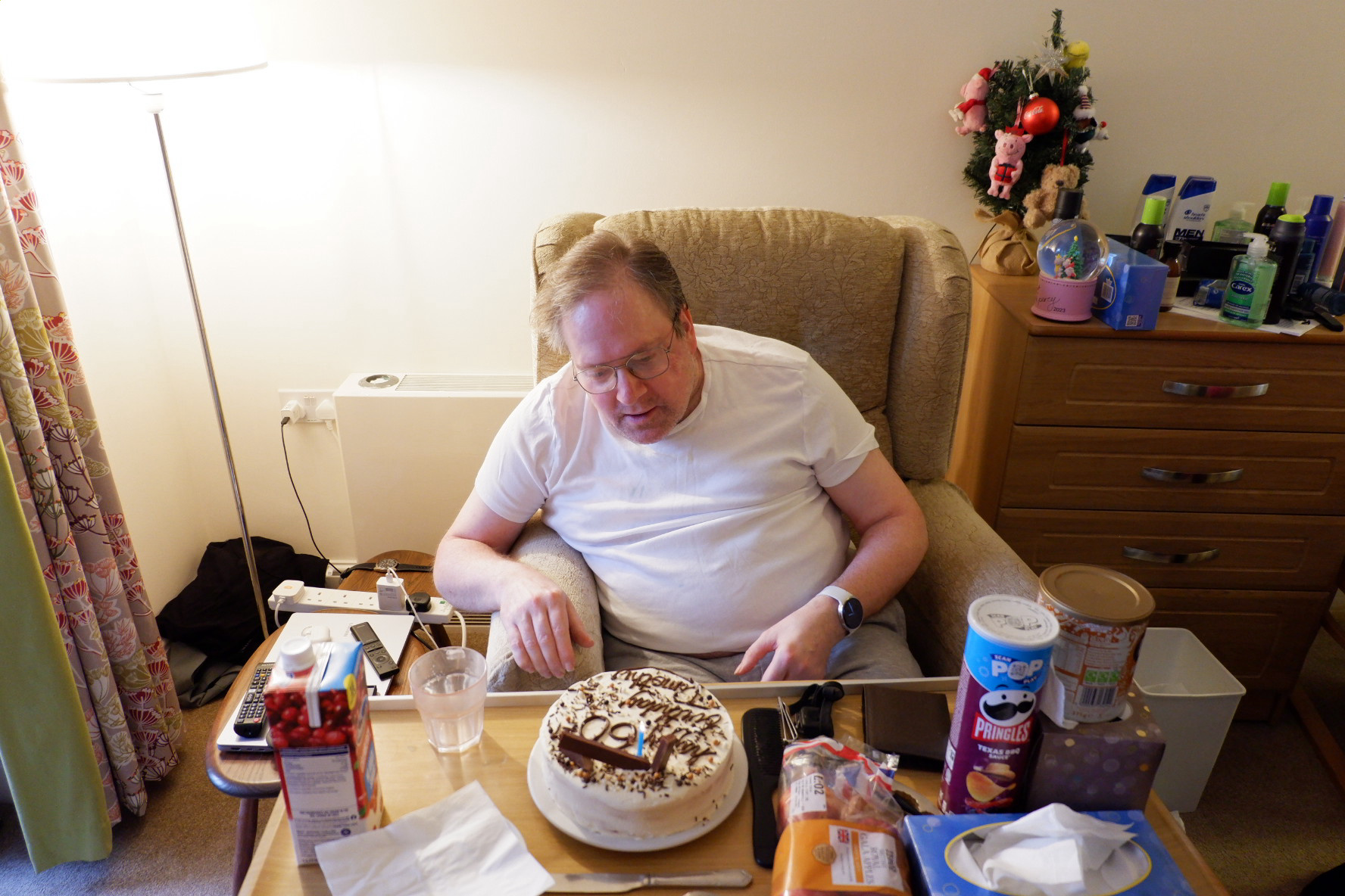 ... birthday cake wearing my excellent glasses watching the bidding room on my TV via puck in home ...