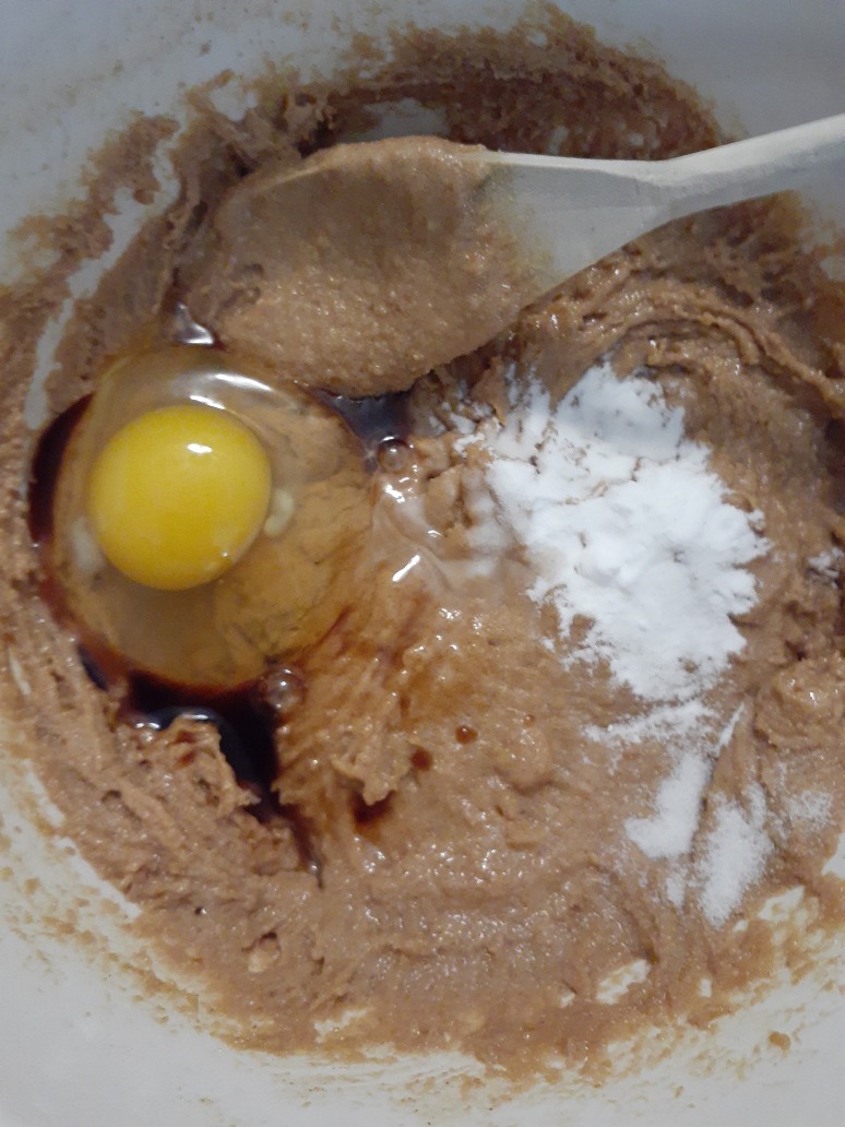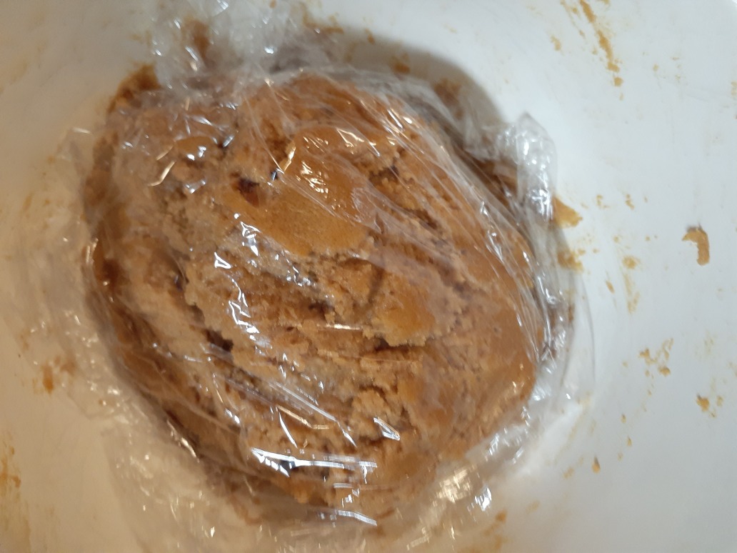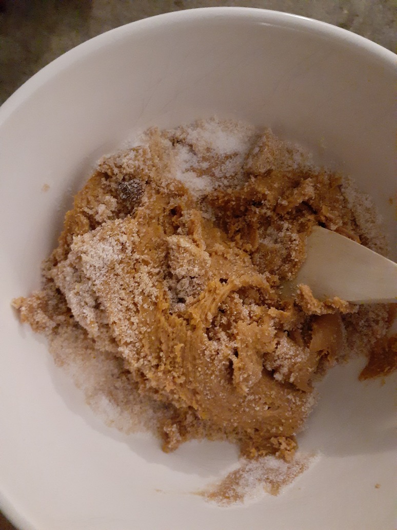 hey /cum/ wanna learn how to make peanut butter cookies? here's 170 grams of peanut butter and 240 grams of sugar. half is dark brown sugar and half is white sugar. mix it with a wooden spoon :3