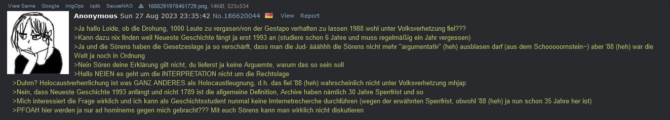 >du bist eine transe>du bist ein sören>du bist kein akademiker (ich auch nicht)Ah ja, die stärksten Argumente von Gottes fähigstem Krieger. Krass, kein Wunder, dass die Kirchen so voll sind, seitdem Mashiro auf /deutsch/ die frohe Kunde verbreitet.