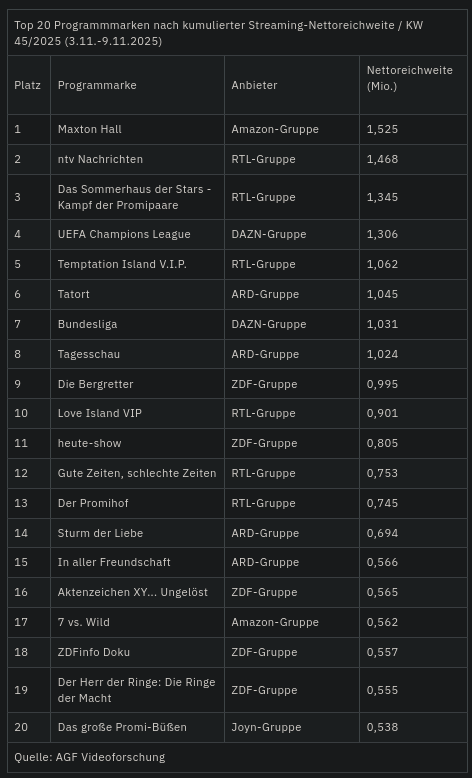 >>217202383>Das Sommerhaus der Stars - Kampf der Promipaare 1,345 Mrd. Zuschauer>ZDFinfo Doku 0,557 Mrd.Wir sind sowas von verloren