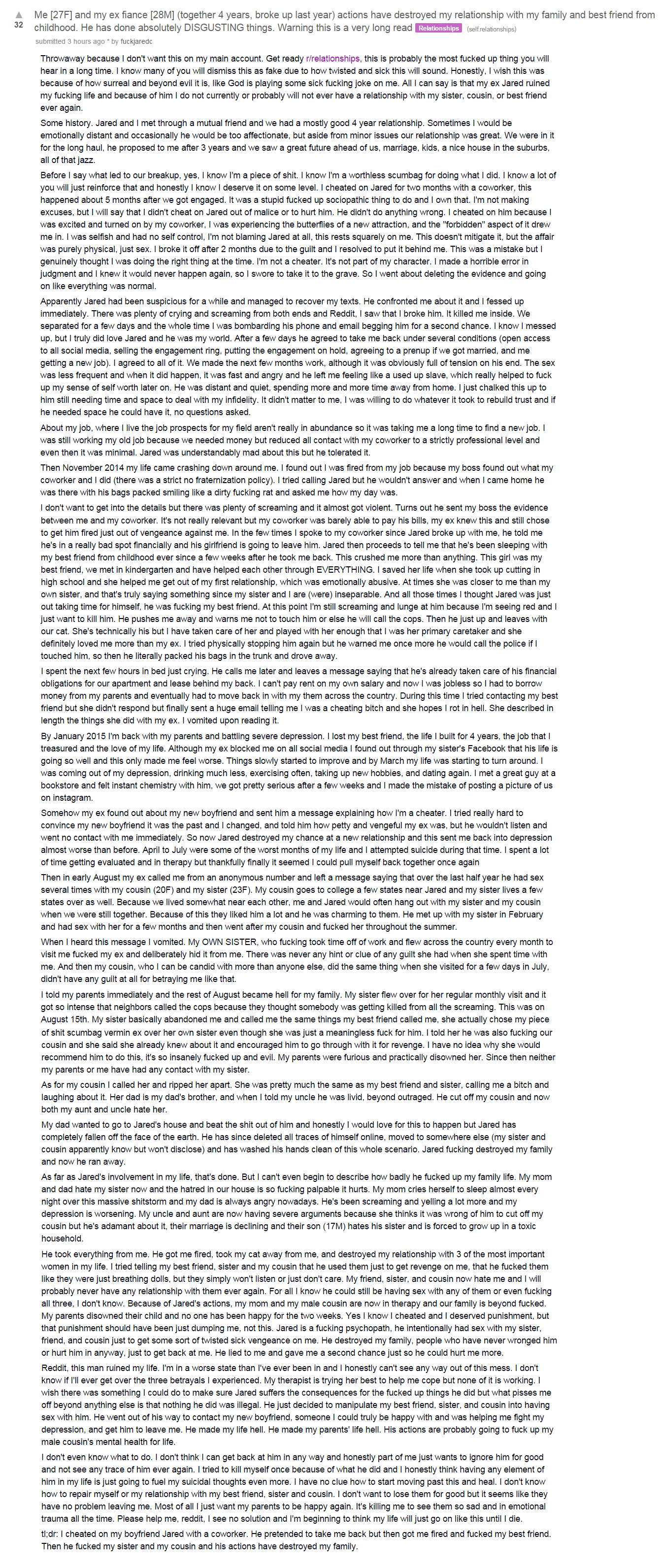 >>217196166>>217196346Big fucking deal. Just tie her up and fuck some bitches (and men too if he's into it) in front of her while telling her how smelly and loose her cunt is and dump her.Stop making a big deal out of it.Be like Jared the based.